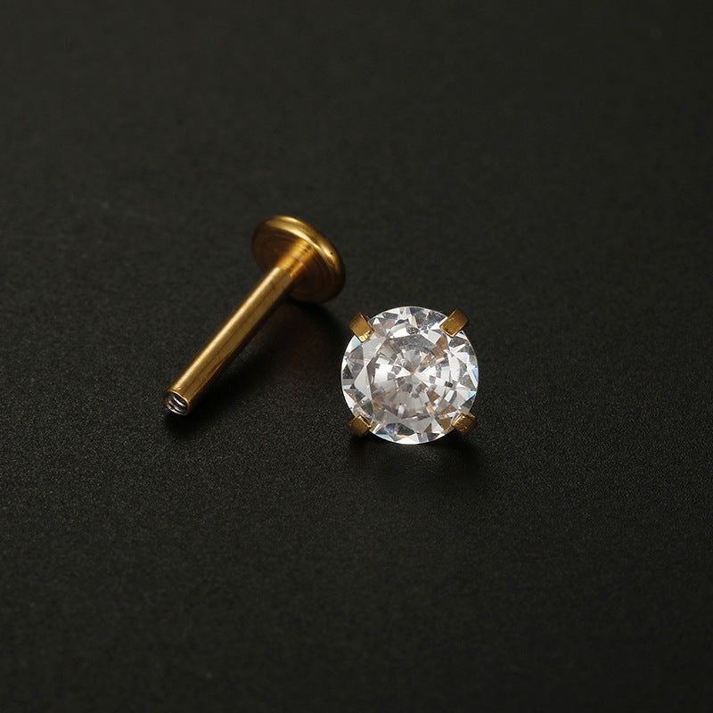 Hypoallergenic gold plated stainless steel flat back piercing stud set with a 5mm round cubic zirconia.