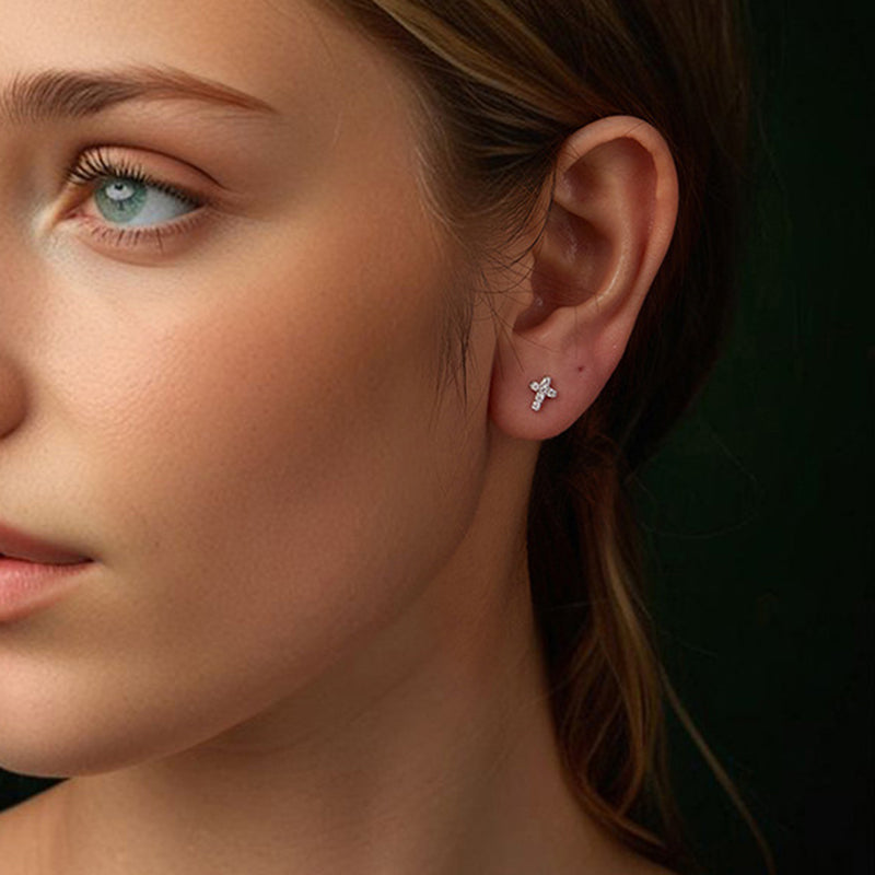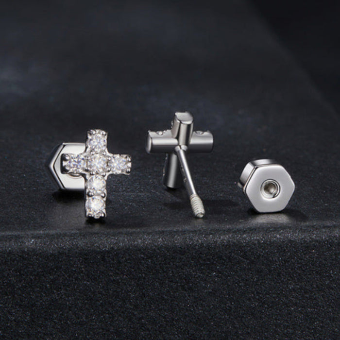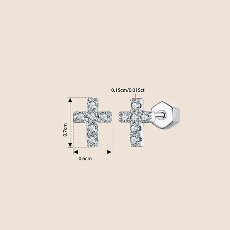 Demure pair of moissanite cross stud earrings in sterling silver.
