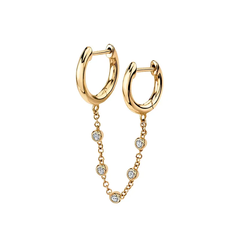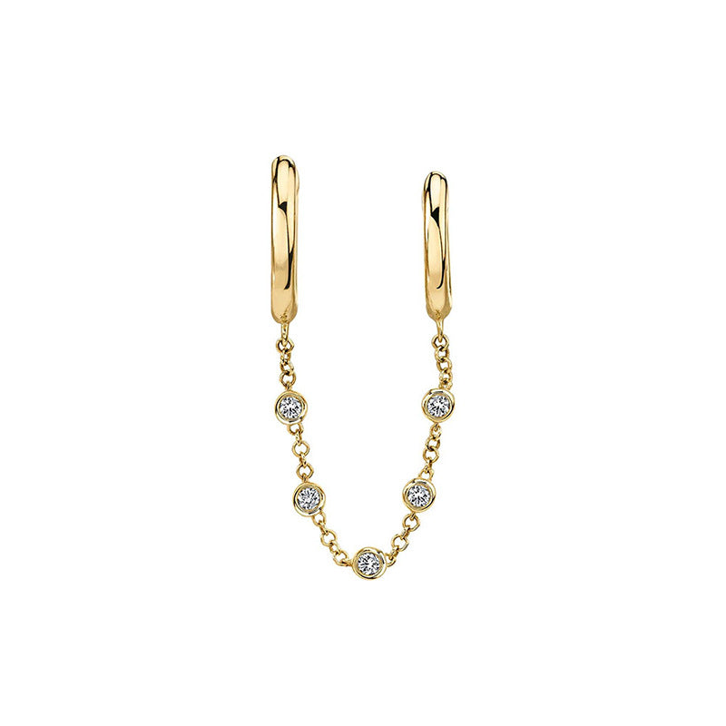 Cubic zirconia double huggie earring made from sterling silver, connected with a delicate chain.