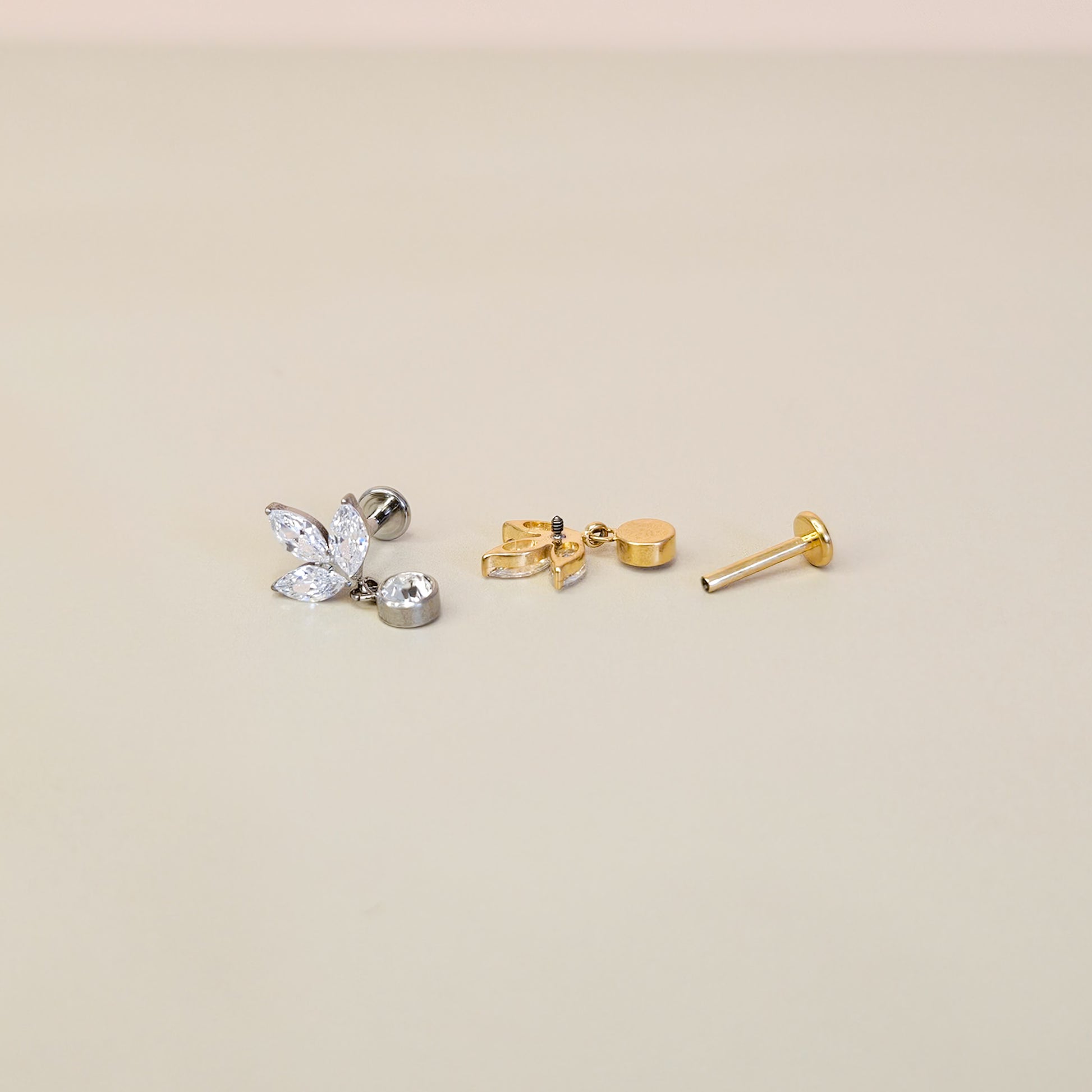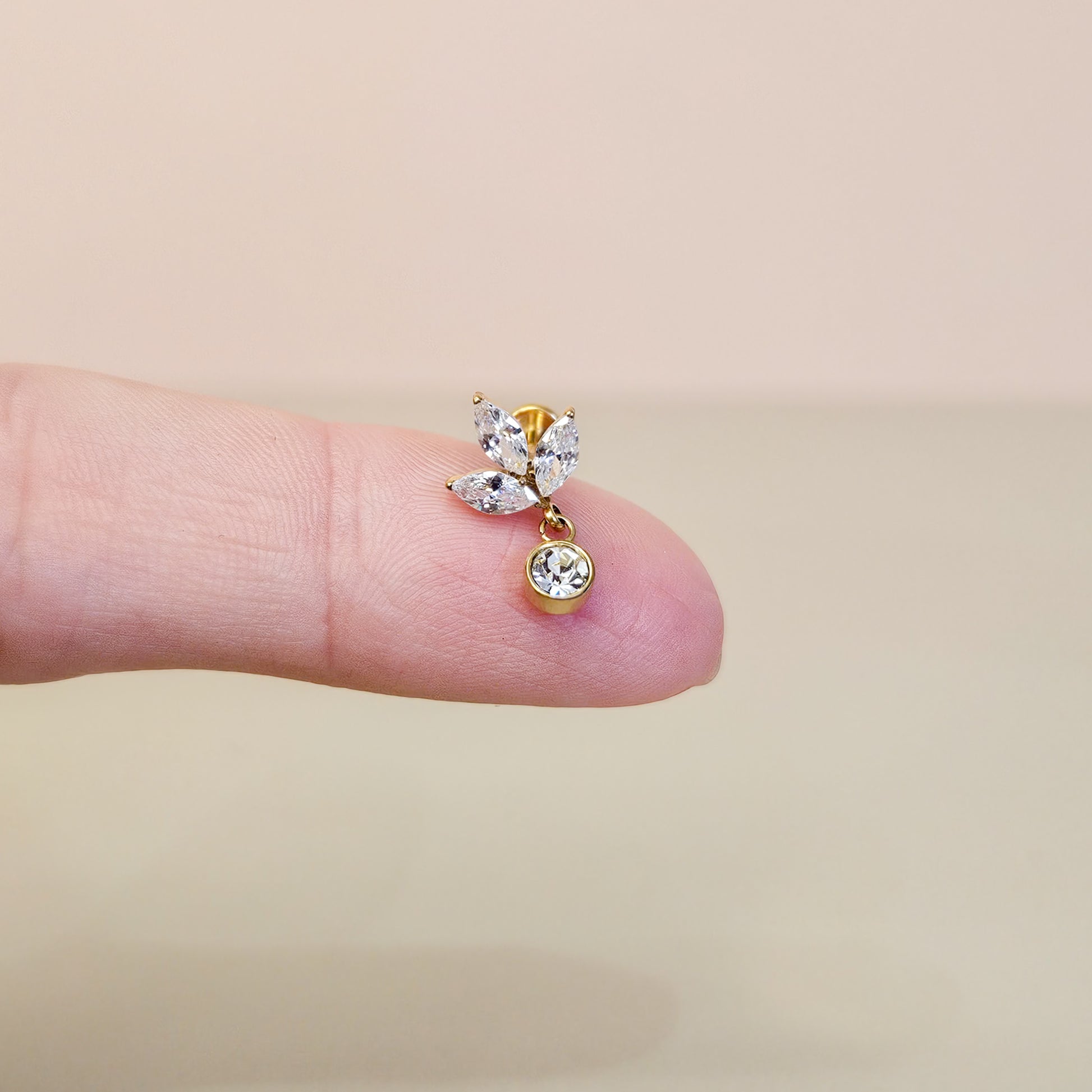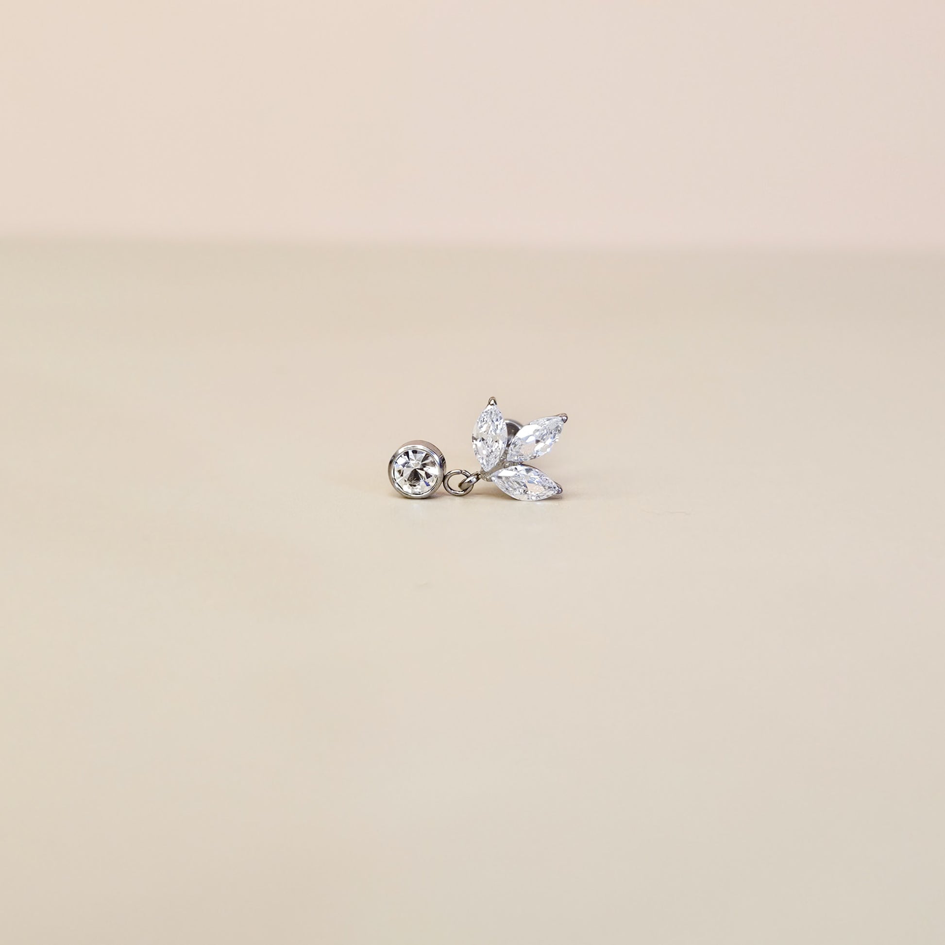 Hypoallergenic G23 titanium flat back cartilage piercing stud with marquise and round cut cubic zirconia.