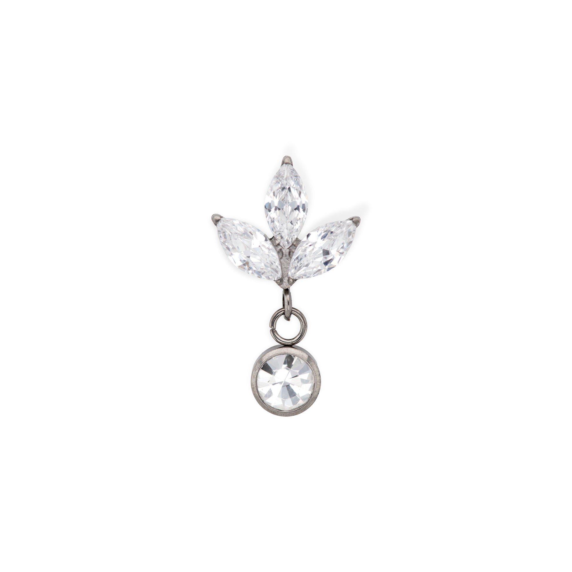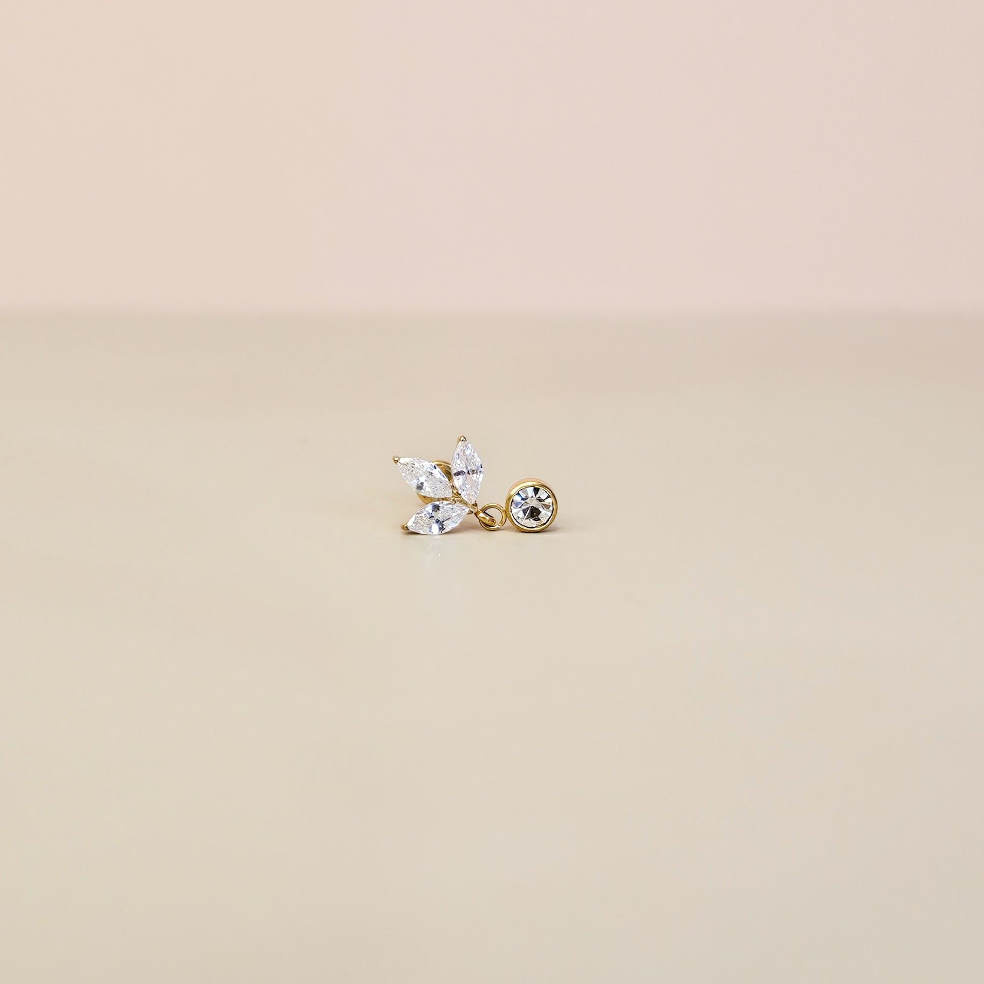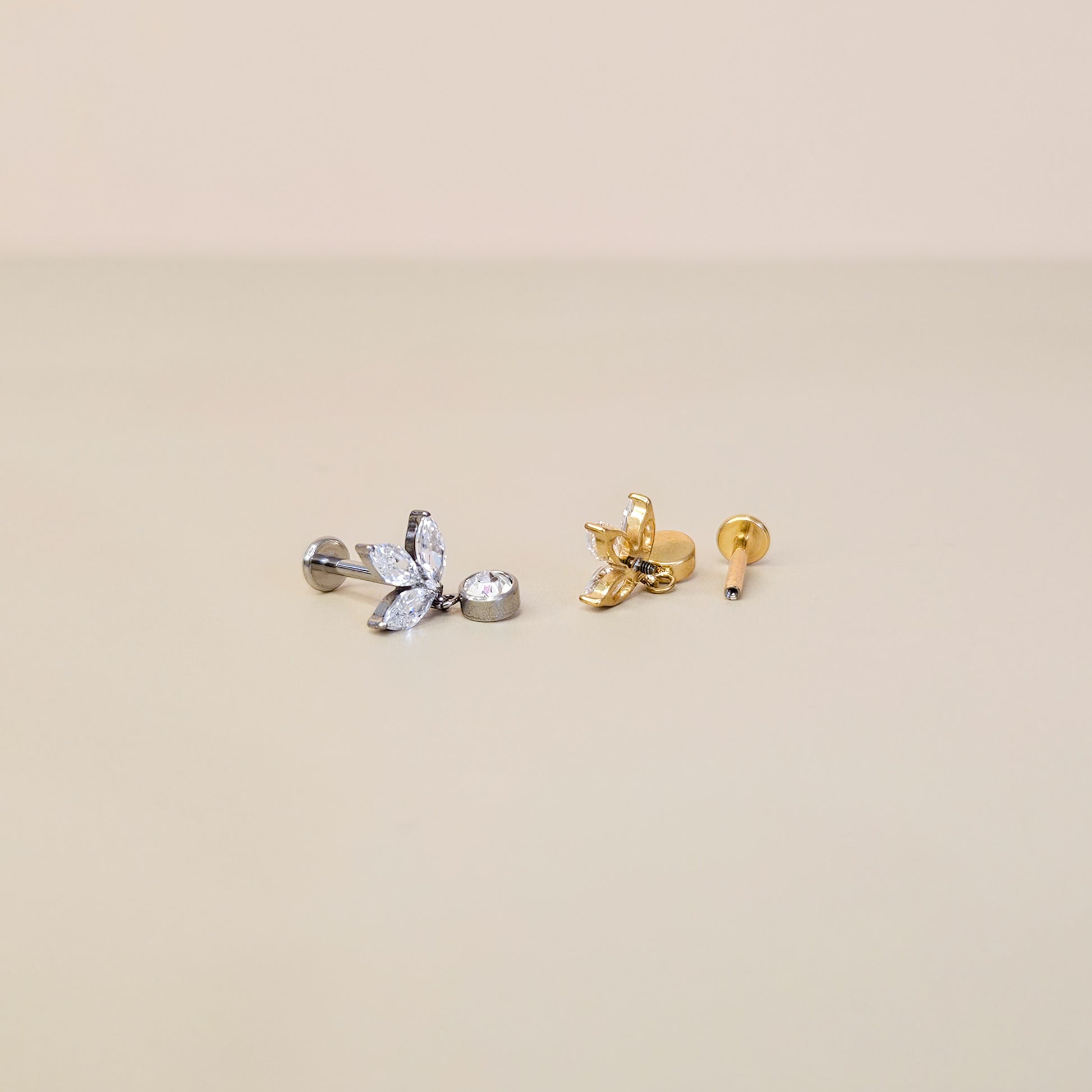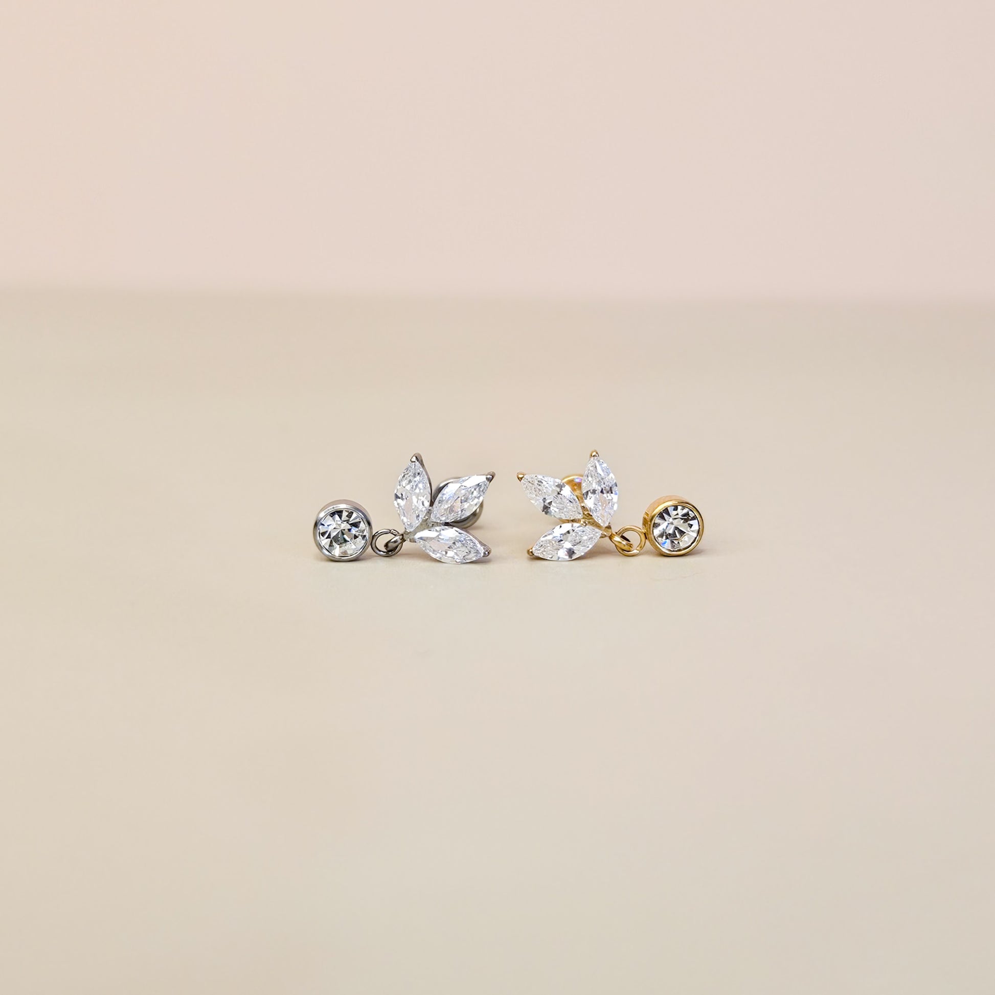Hypoallergenic G23 titanium flat back cartilage piercing stud with marquise and round cut cubic zirconia.