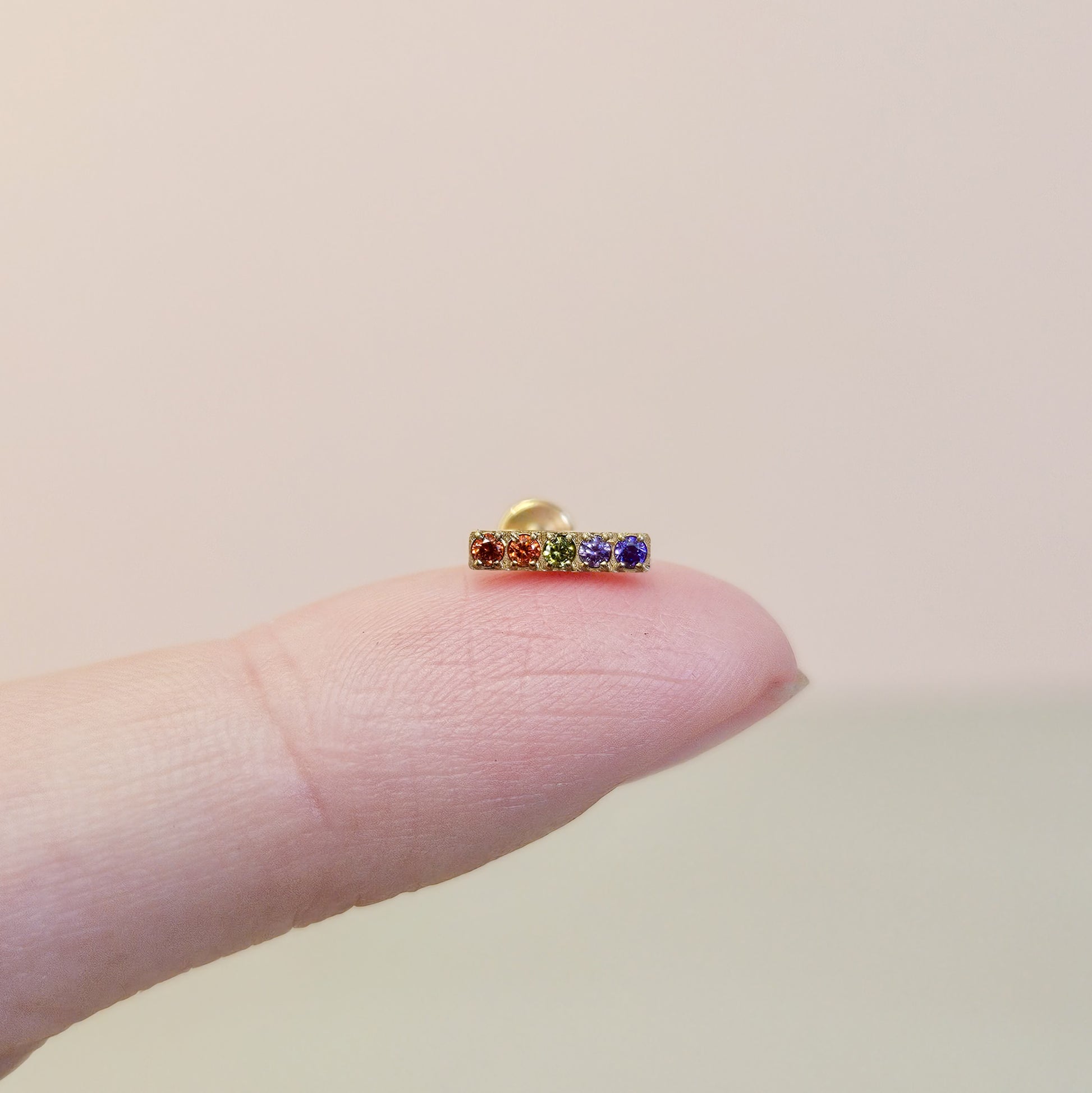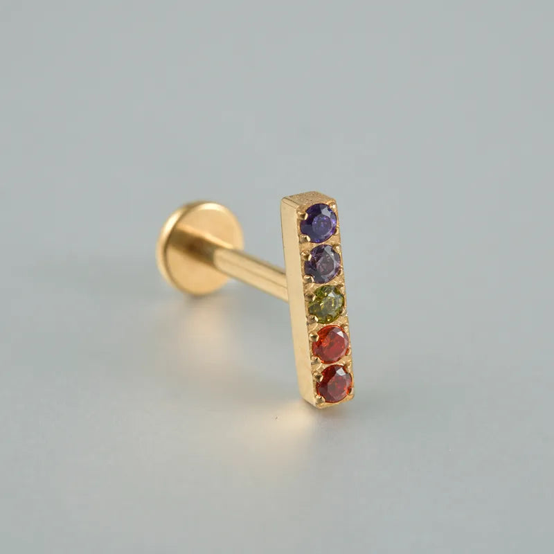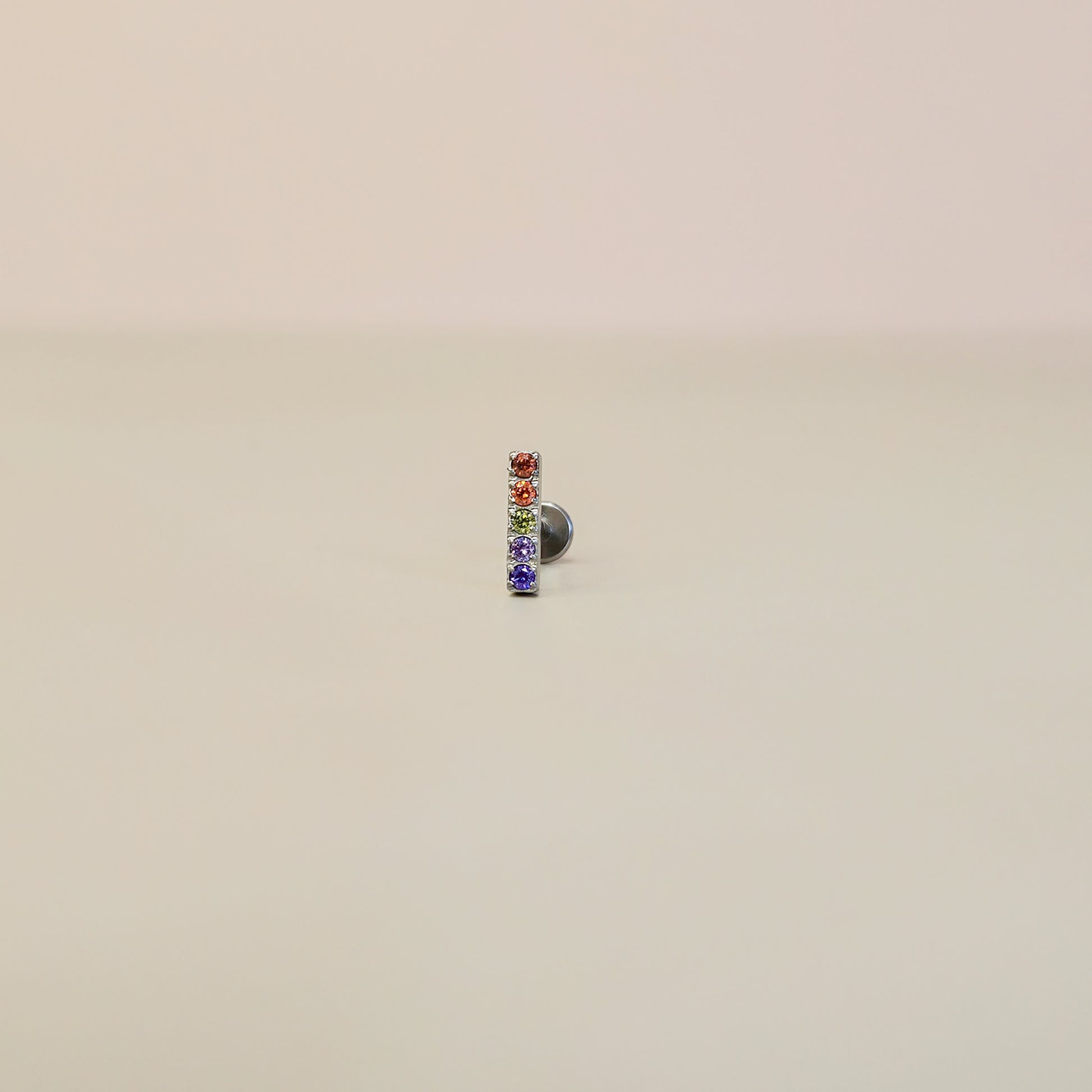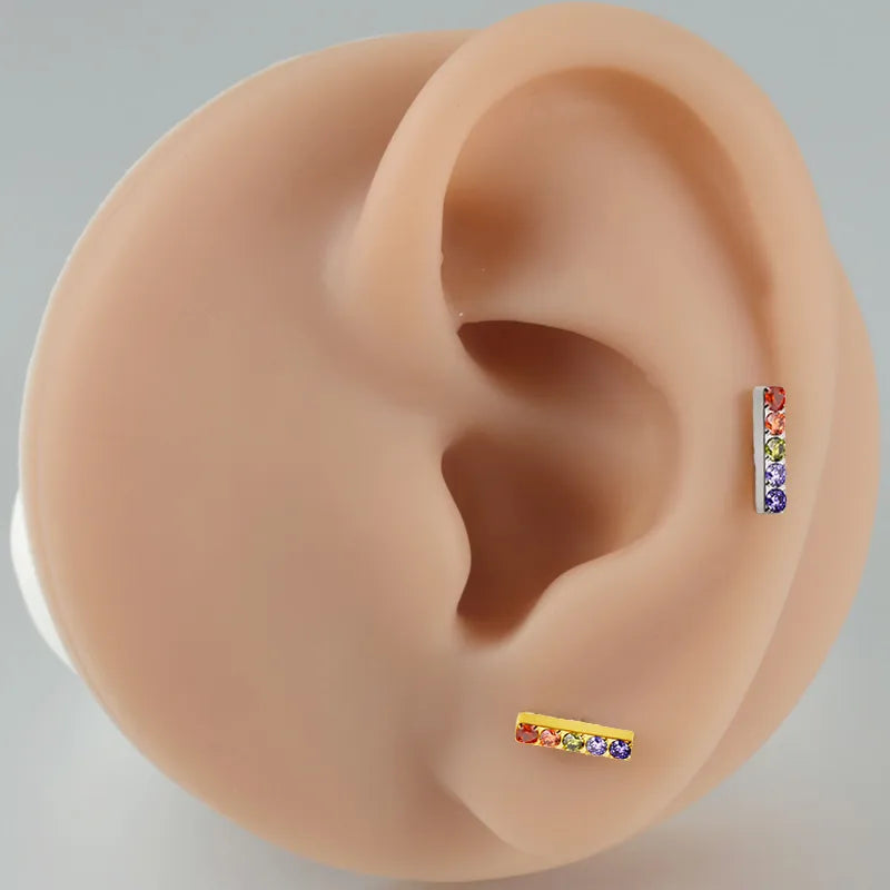 Hypoallergenic G23 titanium flat back cartilage piercing stud with rainbow coloured cubic zirconia.