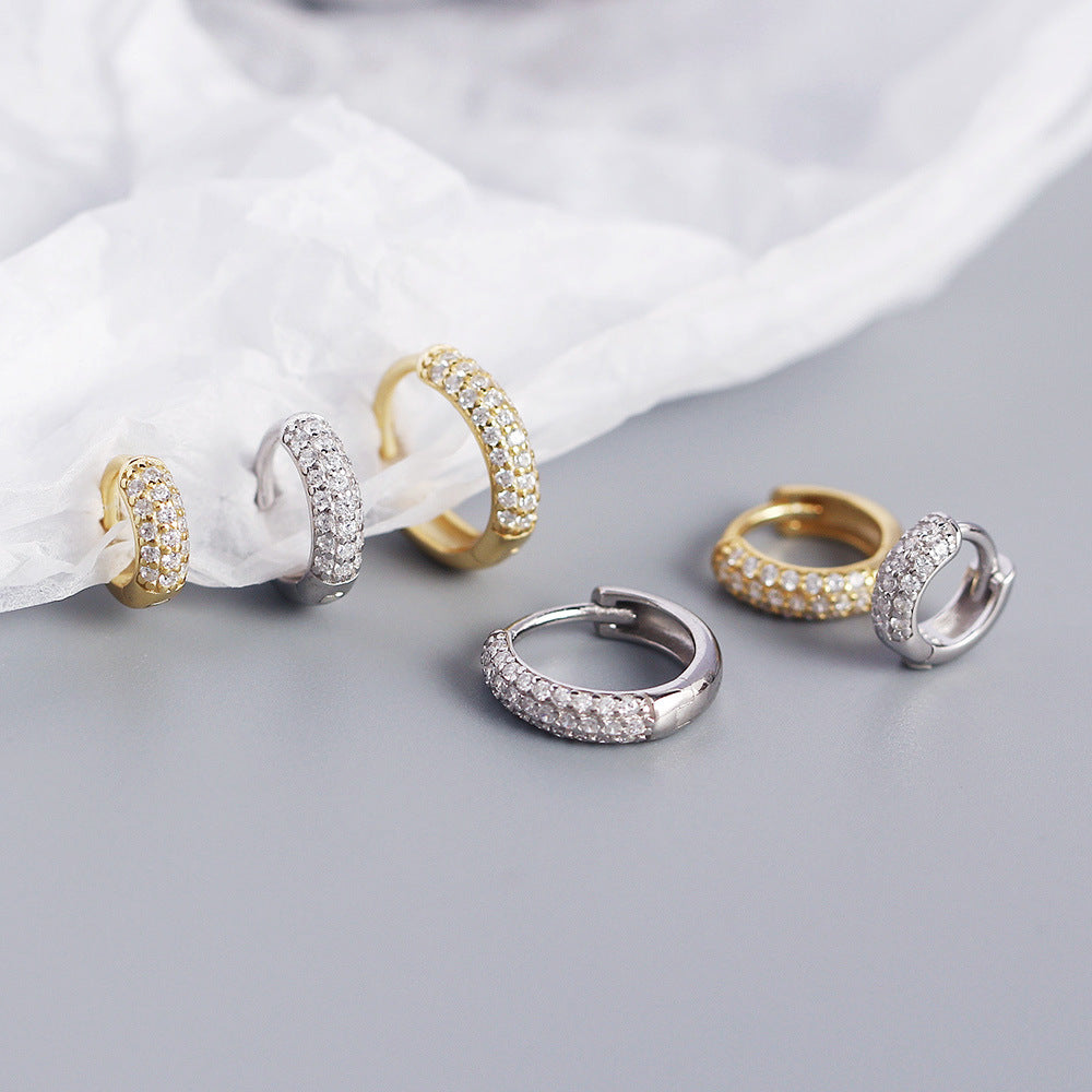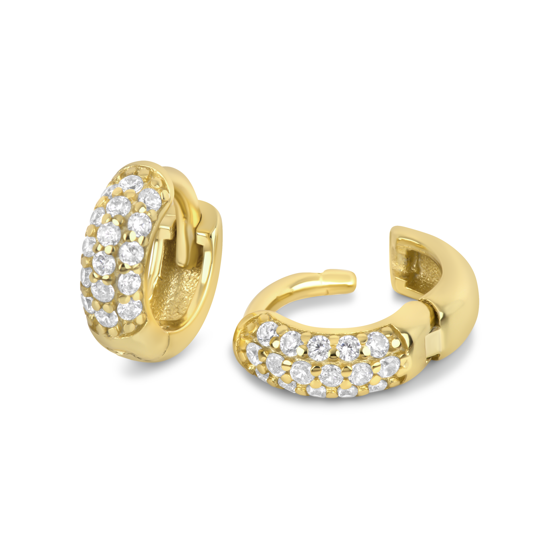 Multiple rows of cubic zirconia set on a slightly thicker sterling silver huggie earrings with a clicker closure for all day comfort.