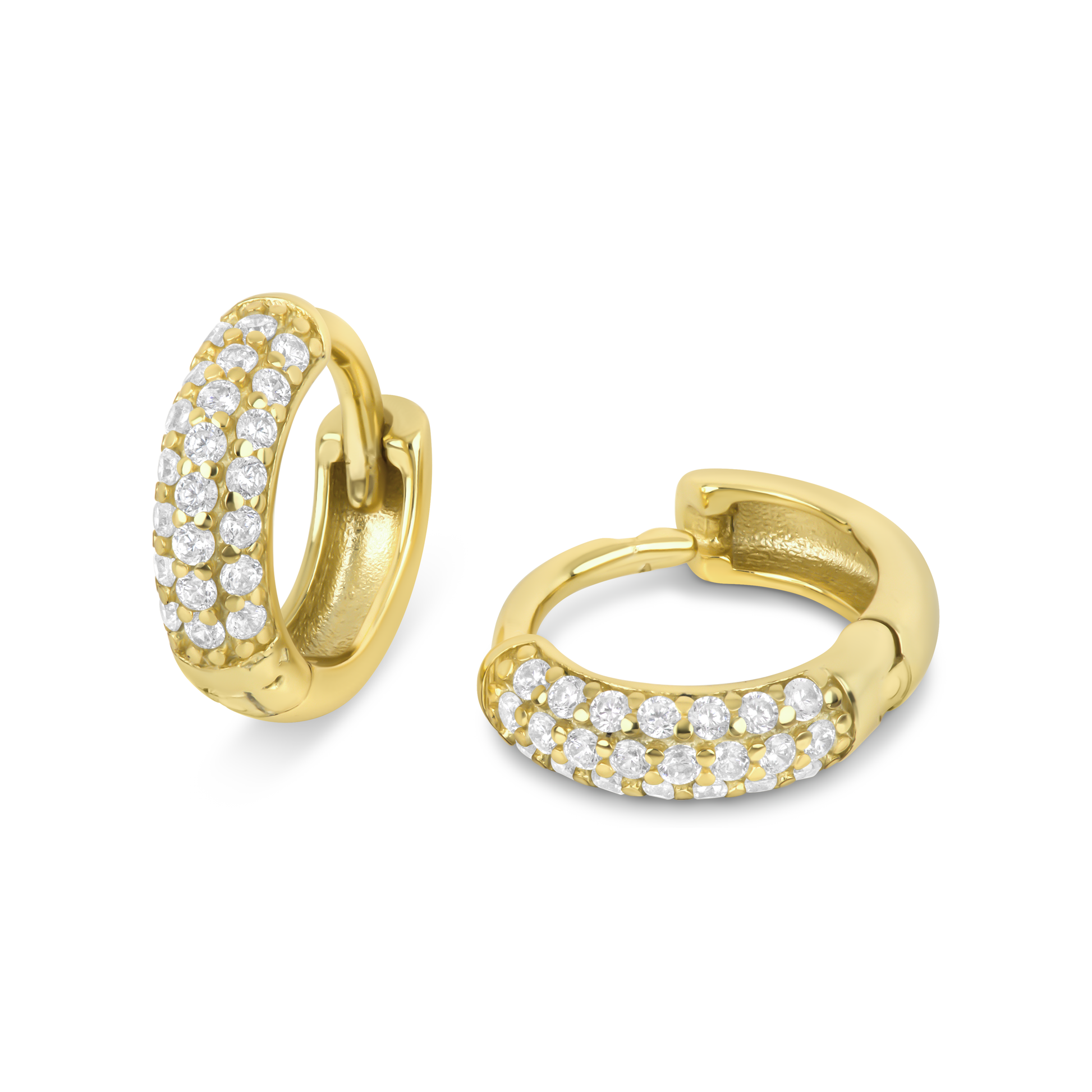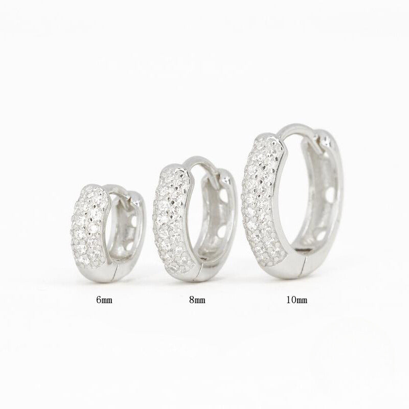 Multiple rows of cubic zirconia set on a slightly thicker sterling silver huggie earrings with a clicker closure for all day comfort.