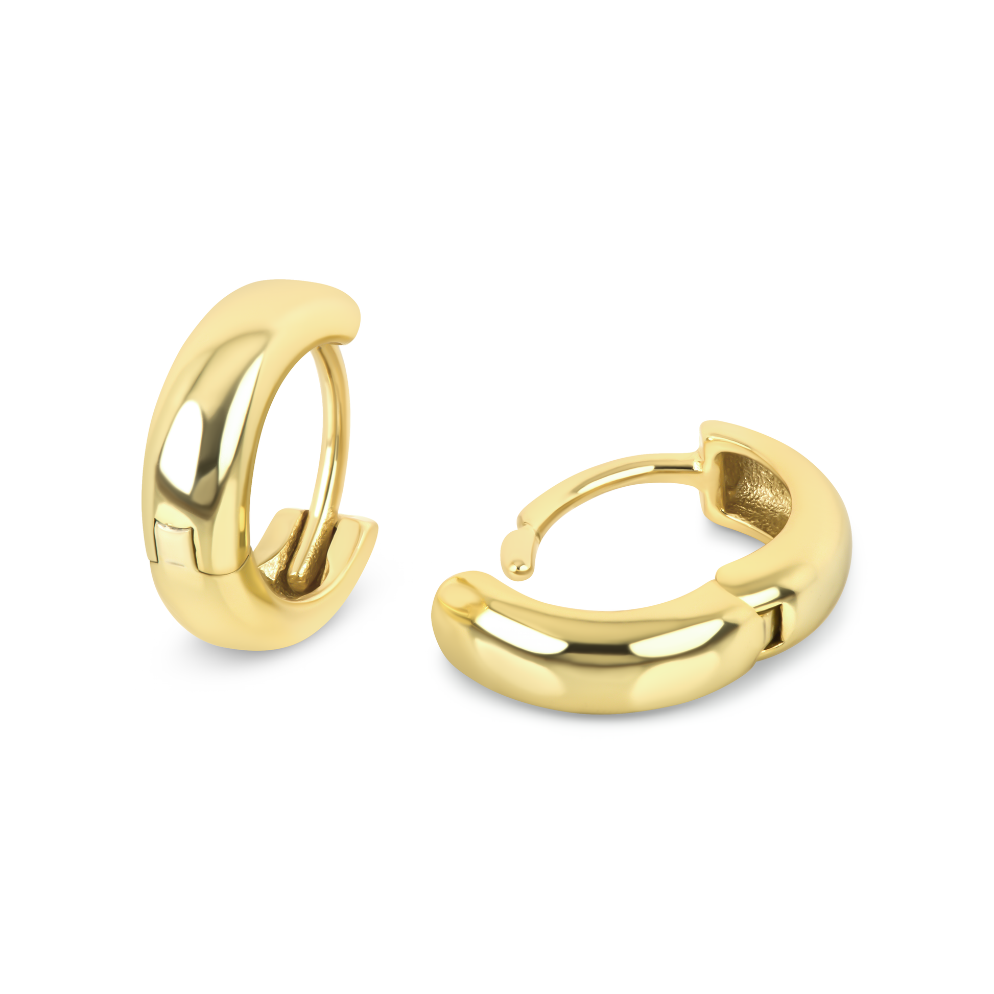 High gloss, slightly thicker sterling silver huggie earrings with a clicker closure for all day comfort.