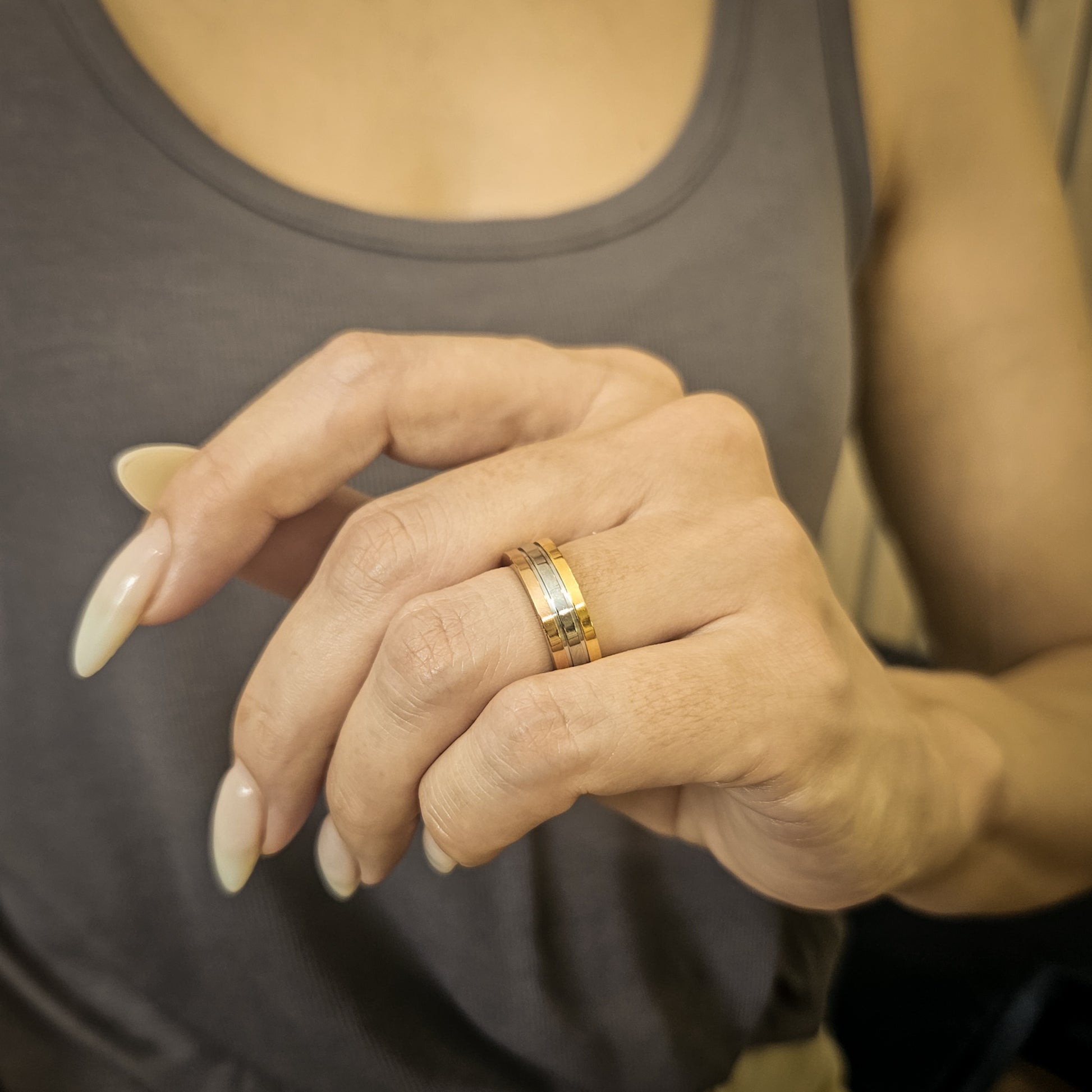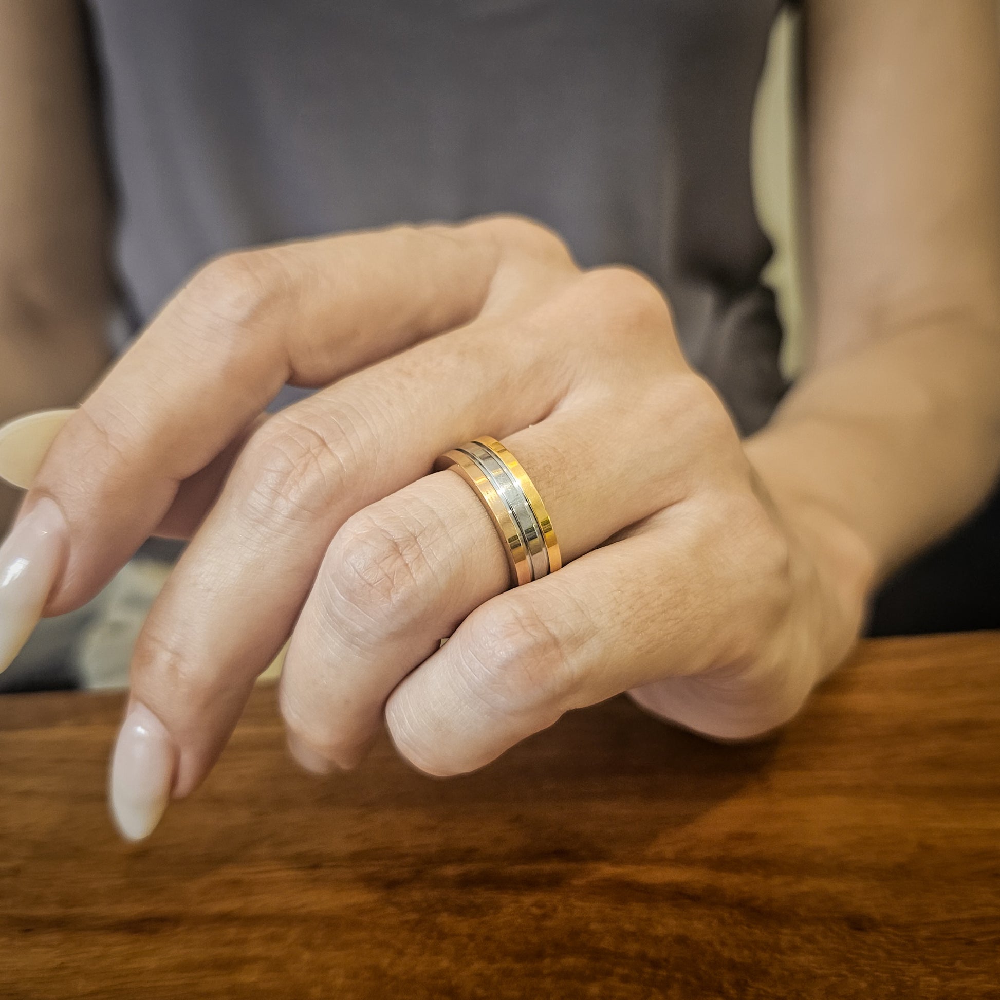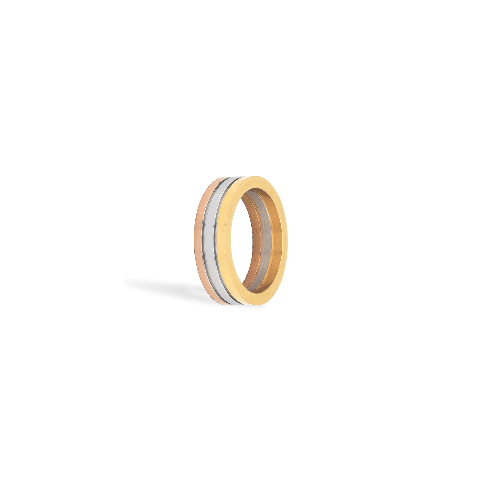 A beautiful gold, silver and rose gold fused ring - ideal for both him and her.